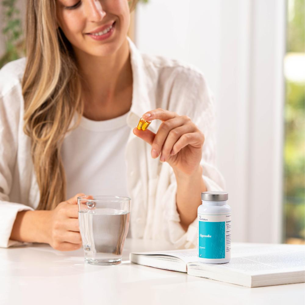 Nutribites Algenolie is een 100% plantaardige en duurzame bron van omega-3 vetzuren (DHA & EPA) uit de Schizochytrium-microalg — ideaal voor wie geen visolie gebruikt. Twee capsules leveren 300 mg DHA en 150 mg EPA, belangrijke bouwstenen voor hersenen, hart en gezichtsvermogen.
