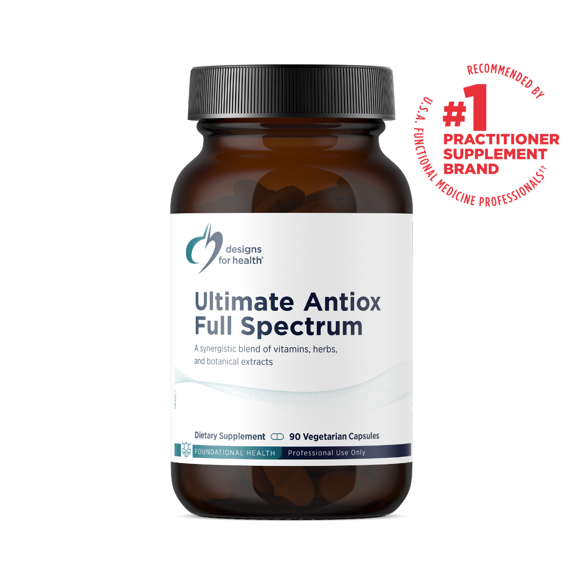 Ultimate Antiox Full Spectrum van Designs for Health is een geavanceerd antioxidantcomplex dat zowel in vet als in water oplosbare antioxidanten combineert. Het bevat onder andere vitamine A, C en E, aangevuld met gestandaardiseerde extracten van ginkgo, druivenpit, kurkuma, resveratrol, lycopeen, luteïne, en diverse kruiden zoals rozemarijn, salie, basilicum en kruidnagel. Deze formule is gericht op celbescherming tegen oxidatieve stress en is vrij van bekende allergenen.