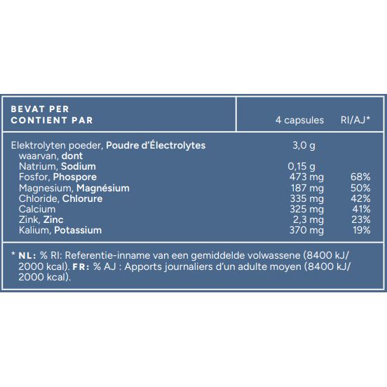 Vegan Elektrolyten - 180 capsules is een voedingssupplement dat kan bijdragen aan een goede elektrolytenbalans dankzij het aanwezige magnesium. Magnesium kan een laxerend effect hebben; bij optreden daarvan kan de dosering worden gehalveerd. De aanbevolen dagelijkse dosering niet overschrijden. Een voedingssupplement mag een gevarieerde en evenwichtige voeding en een gezonde levenswijze niet vervangen.