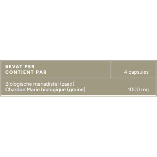 Biologische mariadistel (Silybum marianum) extract. Verdere ingrediënten en hulpstoffen niet vermeld op het beschikbare etiket.