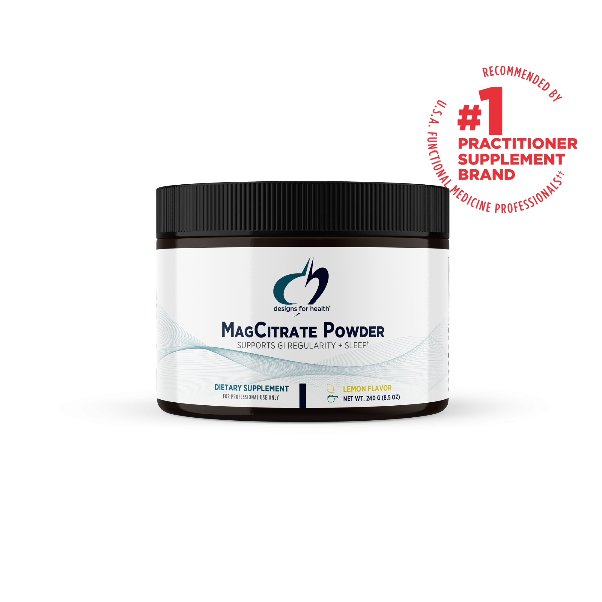 MagCitrate Powder van Designs for Health is een gemakkelijk doseerbaar poedersupplement met magnesium als citraat, een organisch gebonden vorm met hoge biologische beschikbaarheid. Elke dosering van 4 gram levert 300 mg elementair magnesium, opgelost in water met een verfrissende citroensmaak. Magnesiumcitraat staat bekend om zijn goede verdraagbaarheid en opname, zelfs bij gevoelige darmen.