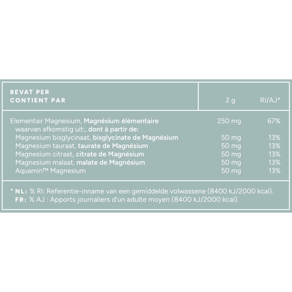 - Bevat magnesium – 250 mg per aanbevolen dosering.