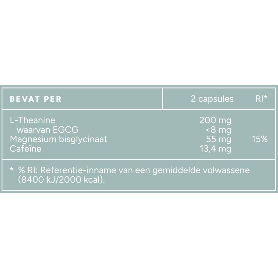 L-Theanin. Enthält Koffein (13,4 mg pro 2 Kapseln). Die genauen Zusatz- und Hilfsstoffe sind auf dem Produktetikett aufgeführt.