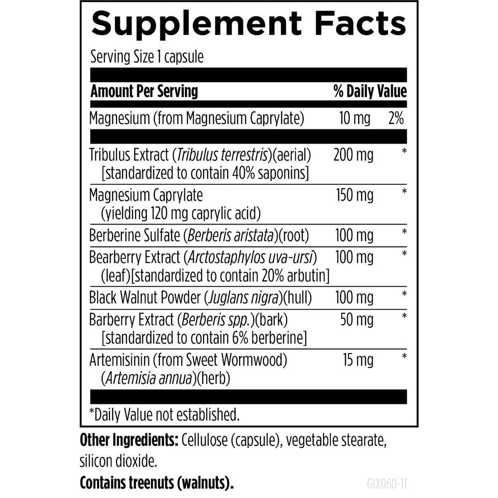 Magnesium, Magnesium (als Caprylat), Berberin (als Sulfat), Berberitze (Berberis spp.), Bärentraube (Arctostaphylos uva-ursi), Wermut, Schwarznuss (Juglans nigra), Tribulus (Tribulus terrestris), Siliciumdioxid, Cellulose, mikrokristalline Cellulose, pflanzliche Stearinsäure.