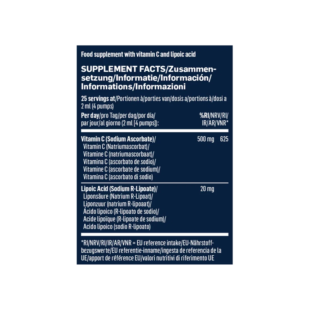 Wasser, Natriumascorbat (Vitamin C), Stabilisator (Glycerin), Emulgator (Sojalecithin), Ethanol, Natrium-R-Lipoat, Zitronenschalenöl (Citrus limon).