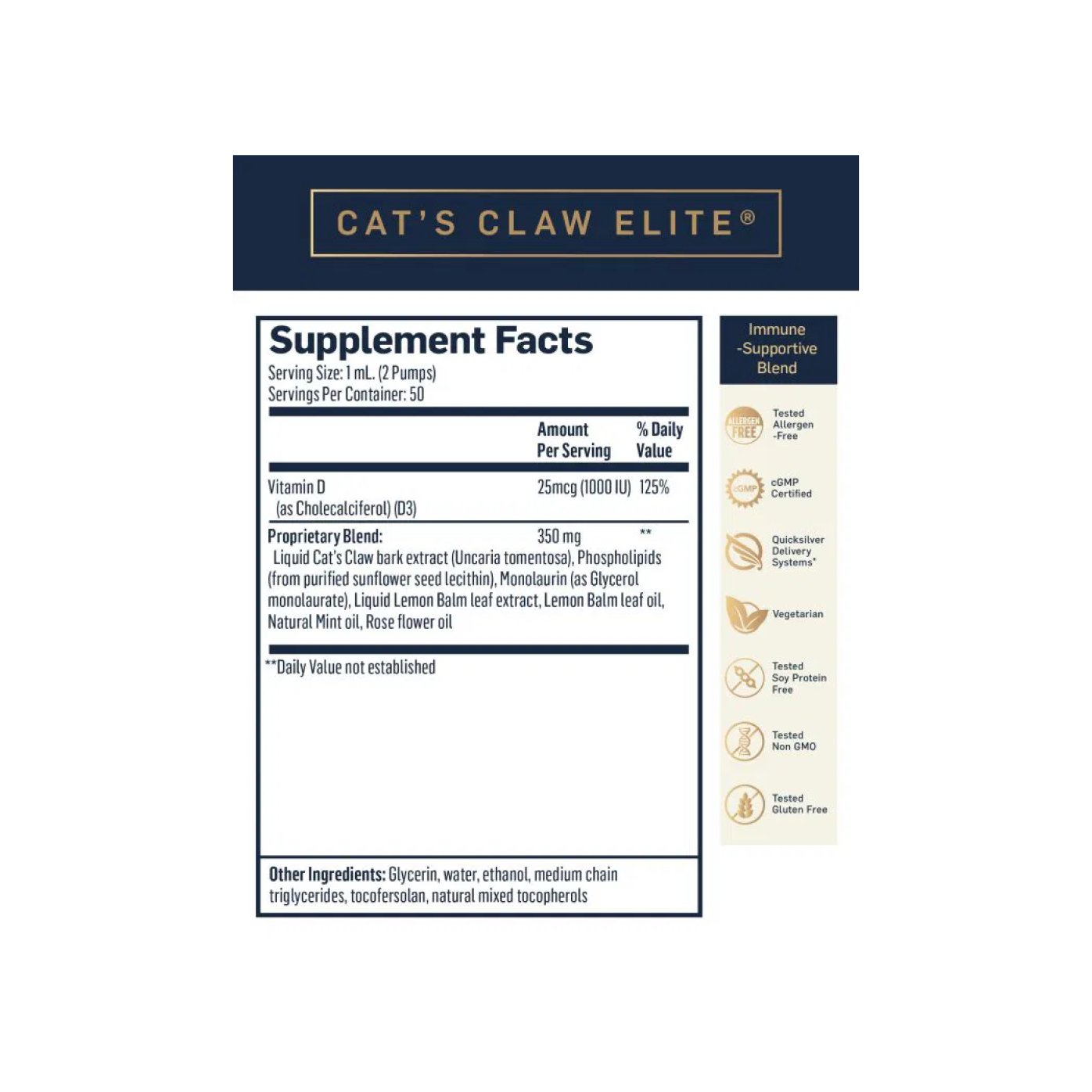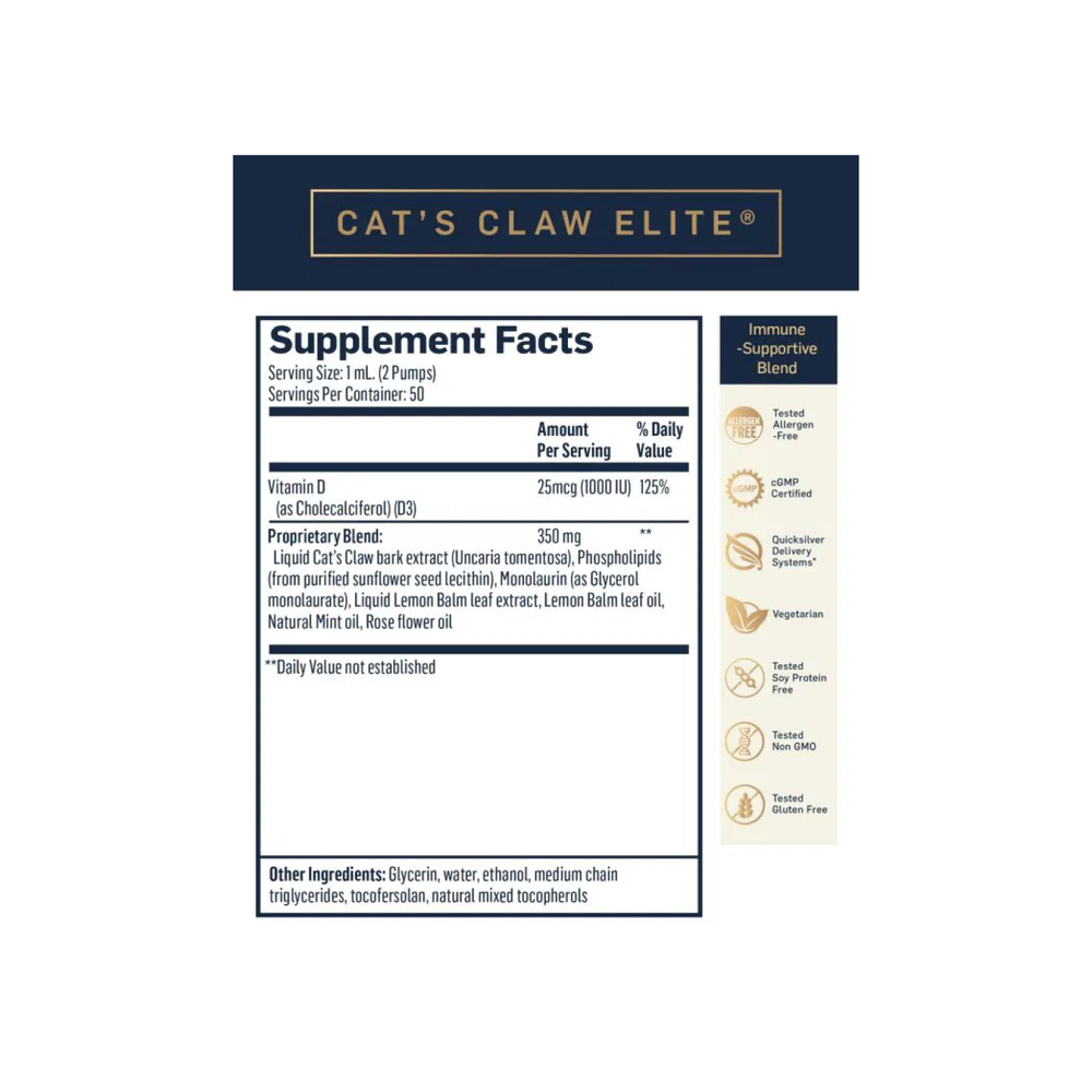 Quicksilver Scientific Nanoemulsified Cat's Claw Elite™ ist eine innovative liposomale Formel , die Katzenkrallenextrakt (Uncaria tomentosa) , Zitronenmelissenextrakt und -öl , Monolaurin und Vitamin D3 enthält.