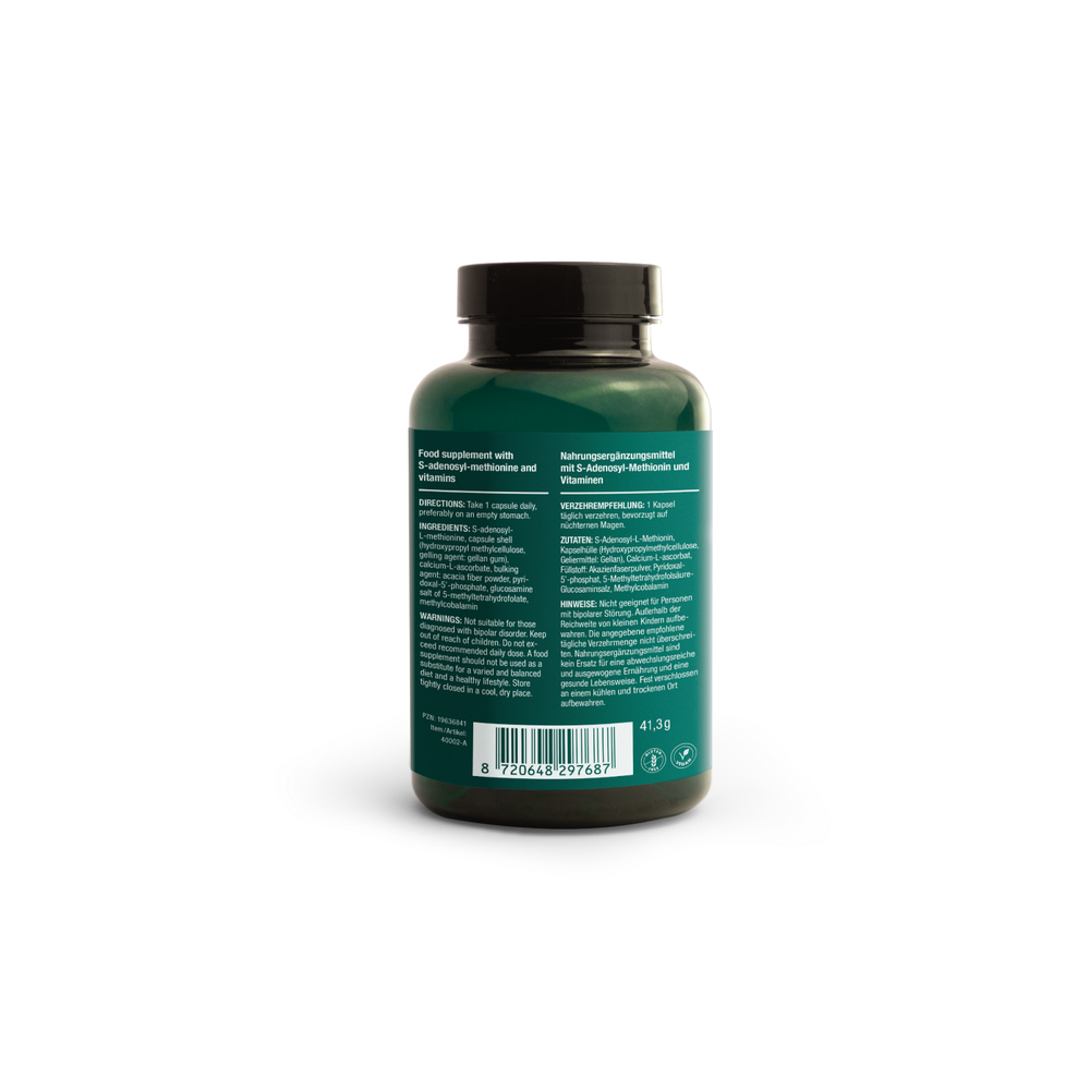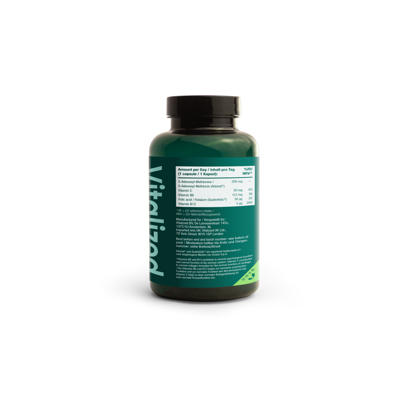Diese Formel enthält 200 mg S-Adenosyl-Methionin (SAMe) pro Kapsel in der patentierten Adonat® -Form, ergänzt mit aktiven B-Vitaminen und Vitamin C zur Unterstützung von Energie, Stimmung und Homocysteinstoffwechsel.