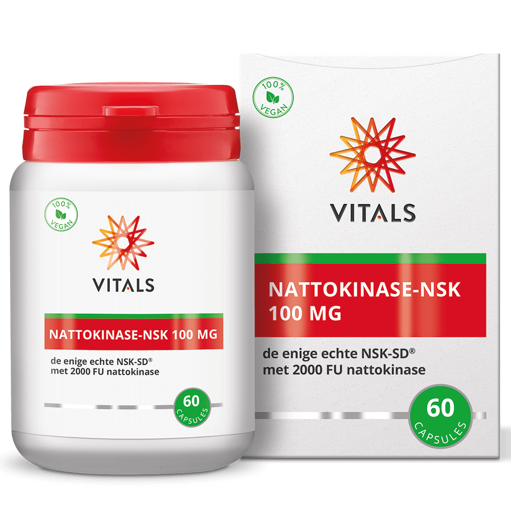 Regular price €31,96Toegestane gezondheidsclaims:GeenSamenstelling per capsule:Gefermenteerd sojabonenextract (NSK-SD®)100 mgWaarvan nattokinase2000 FU**FU = Fibrinolytic UnitsNSK-SD® is een geregistreerd handelsmerk van Japan Bio Science Laboratories.GebruikAls voedingssupplement voor volwassenen, 1 capsule bij een maaltijd met water innemen. Houd u aan de aanbevolen dosering. Geschikt voor vegetariërs en veganisten.IngrediëntenAntiklontermiddel (acaciagom), plantaardige capsule (pullulan, uit gefermenteerd cassave-zetmeel), resistente dextrine, gefermenteerd sojabonenextract.Dit product is een voedingssupplement (Superfood). Hou je aan de aanbevolen dosering. Een gevarieerde, evenwichtige voeding en een gezonde leefstijl zijn belangrijk. Een voedingssupplement is geen vervanging van een gevarieerde voeding. Buiten bereik van jonge kinderen houden. Droog, afgesloten en bij kamertemperatuur bewaren, tenzij anders geadviseerd op de verpakking. Raadpleeg een arts, apotheker of therapeut alvorens supplementen te gebruiken in geval van zwangerschap, lactatie, medicijngebruik en ziekte.
