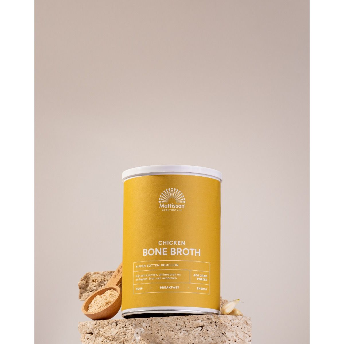 Chicken Bone Broth (400g) is a dehydrated bone broth powder made from chicken bones and concentrated into a protein powder. It is rich in type I collagen, vitamins, minerals, and (essential) amino acids. This dietary supplement can contribute to your daily protein intake and can support supplemental collagen in your diet. Do not exceed the recommended dose.