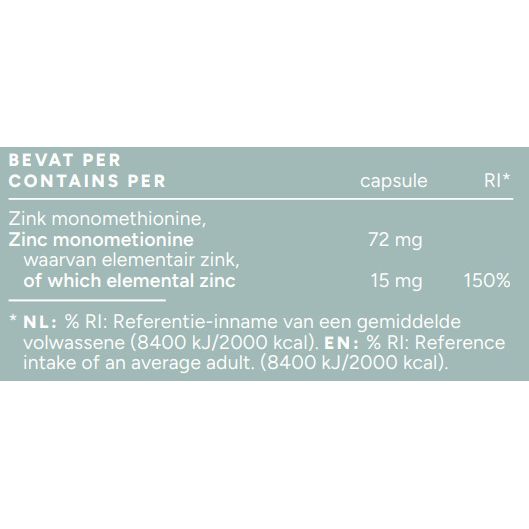 - Contains zinc in bound form – Zinc as zinc methionine, 15 mg per capsule.