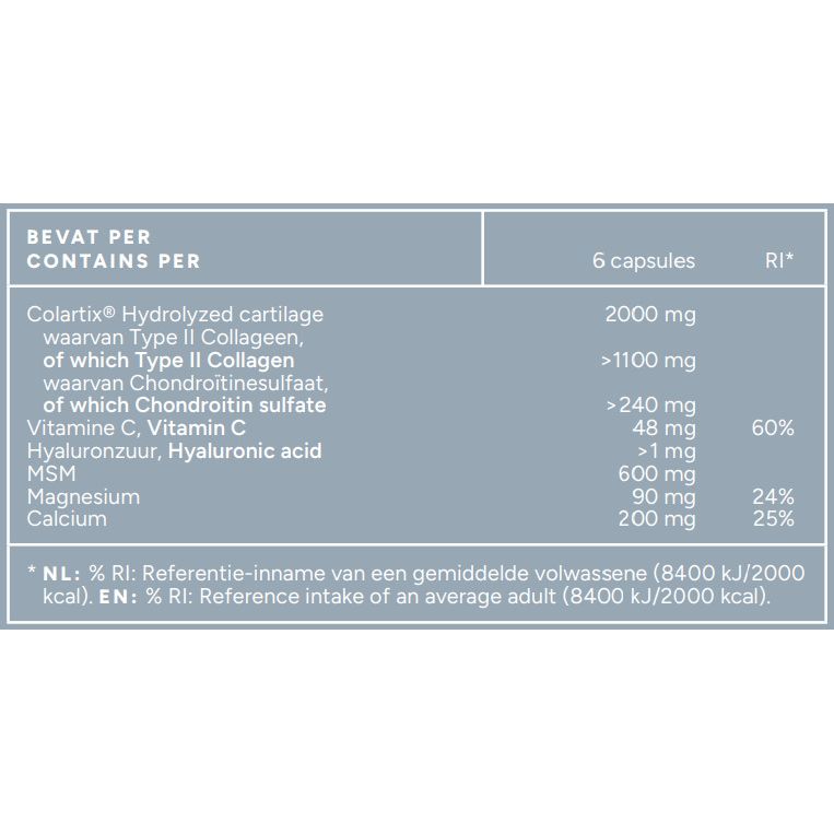 Collagen - Colartix® - 180 capsules is a dietary supplement derived from bovine cartilage and naturally contains the glycosaminoglycan (GAG) chondroitin sulfate. This supplement can help replenish the nutrients found in collagen-rich sources. Do not exceed the recommended dose.