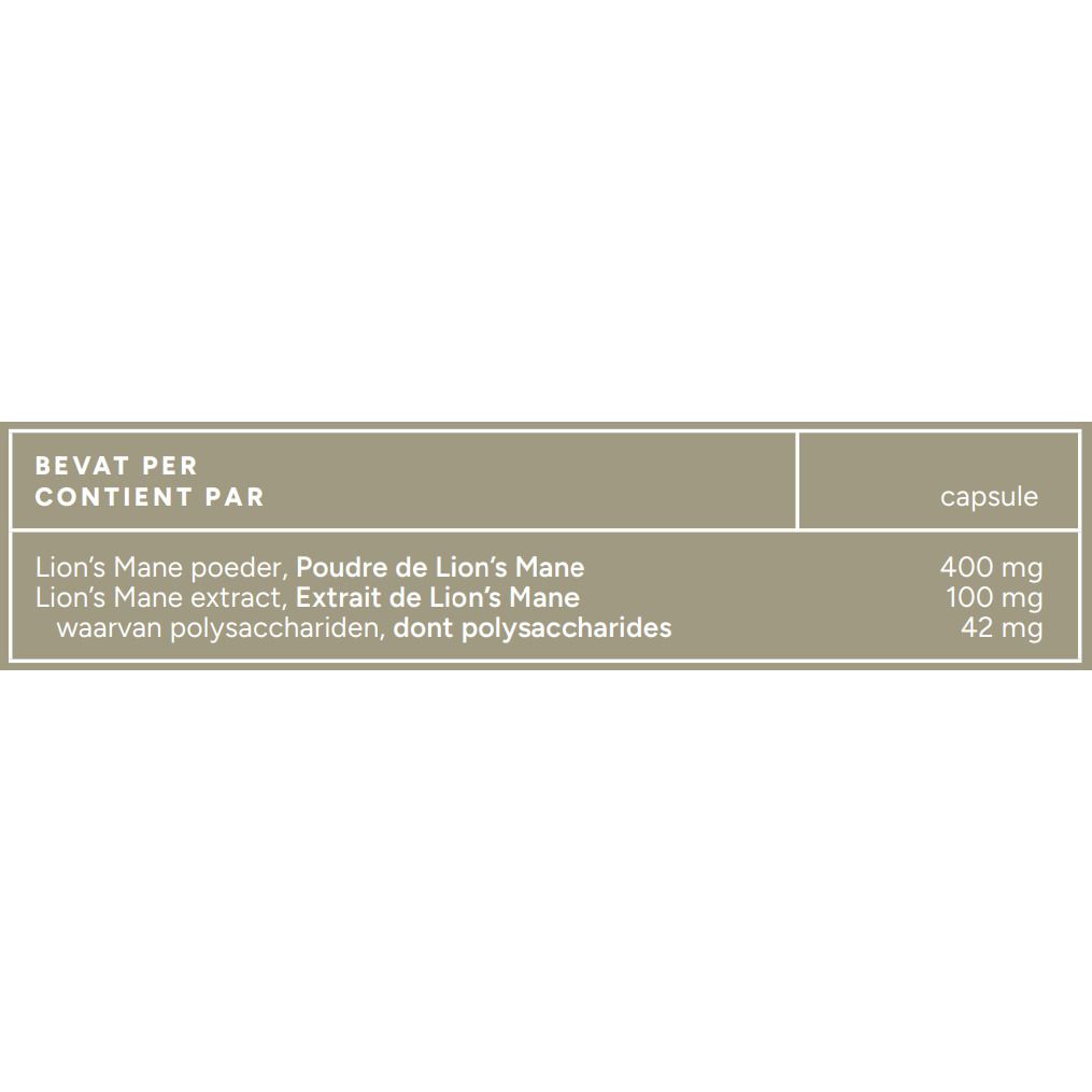 Lion's Mane (Hericium erinaceus) powder (organic), capsule shell, and excipients: see label. The exact composition and excipients are listed on the product label.