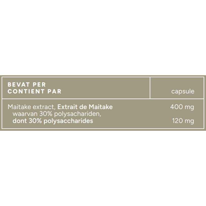 This dietary supplement contains 400 mg of organic Maitake (Grifola frondosa) per capsule. It is intended as a supplement to a varied and balanced diet and can help supplement your daily nutritional intake.