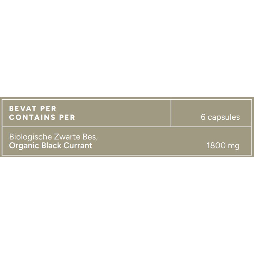 Organic blackcurrant (exact additional ingredients and capsule shell not listed on the available product information).