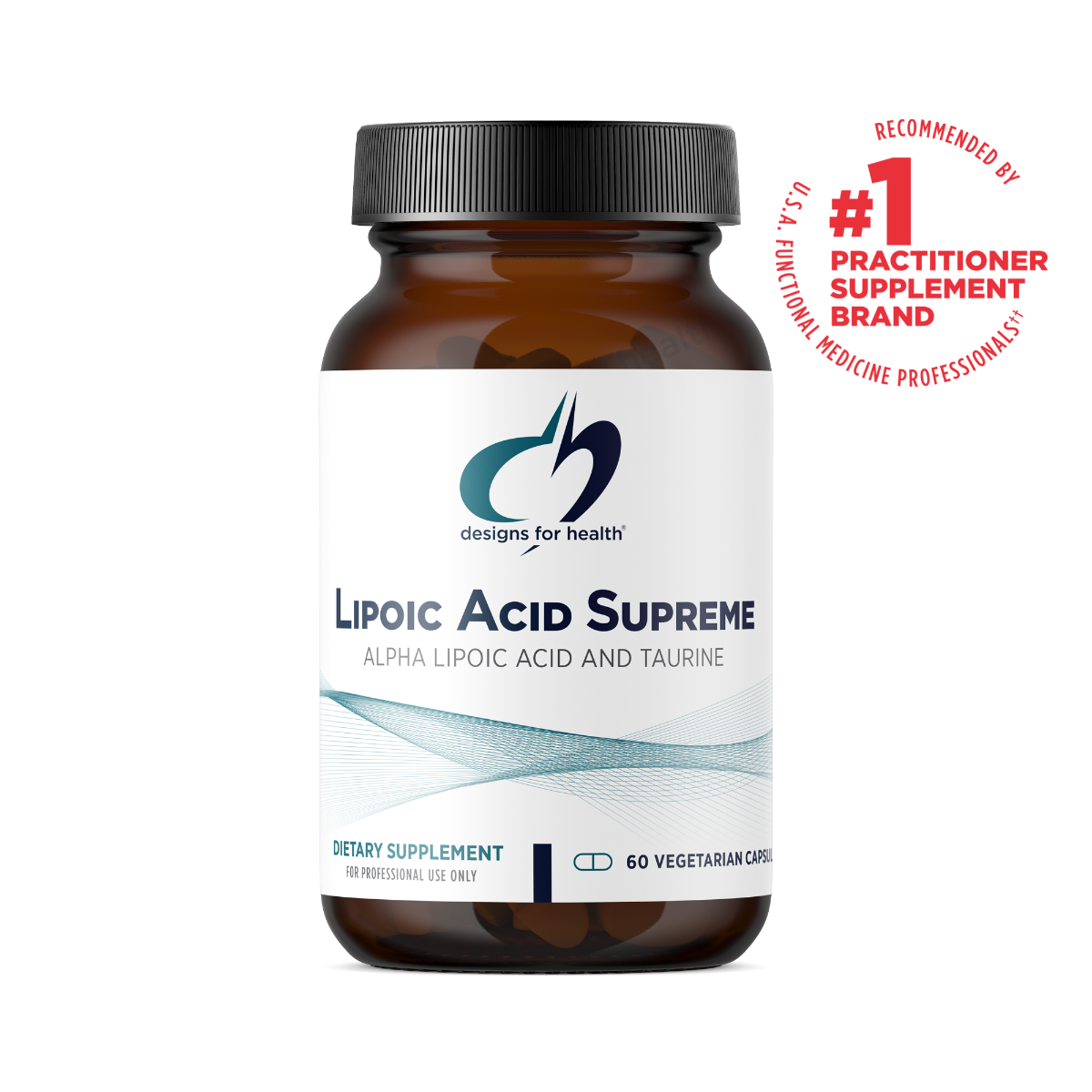 Designs for Health's Lipoic Acid Supreme is a powerful formula that delivers 300 mg of alpha-lipoic acid , 500 mg of taurine , and 4,000 mcg of biotin per capsule. Lipoic acid (also known as thioctic acid) is a sulfur-containing compound that plays a role in the body as a coenzyme in energy production in the mitochondria. What makes alpha-lipoic acid unique is that it is both water- and fat-soluble , making it active in various cell compartments.