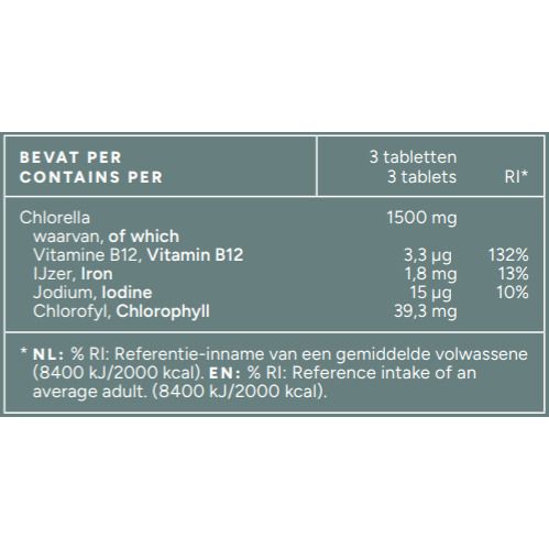 Free from information about additional ingredients; contains only chlorella according to label information.