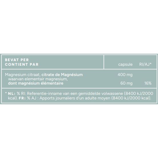 Magnesium Citrate 400mg is a dietary supplement in capsule form (180 capsules) containing magnesium citrate. This supplement can help maintain strong and supple muscles and support the normal functioning of the nervous system. Each capsule is rich in elemental magnesium for daily supplementation of your magnesium intake.