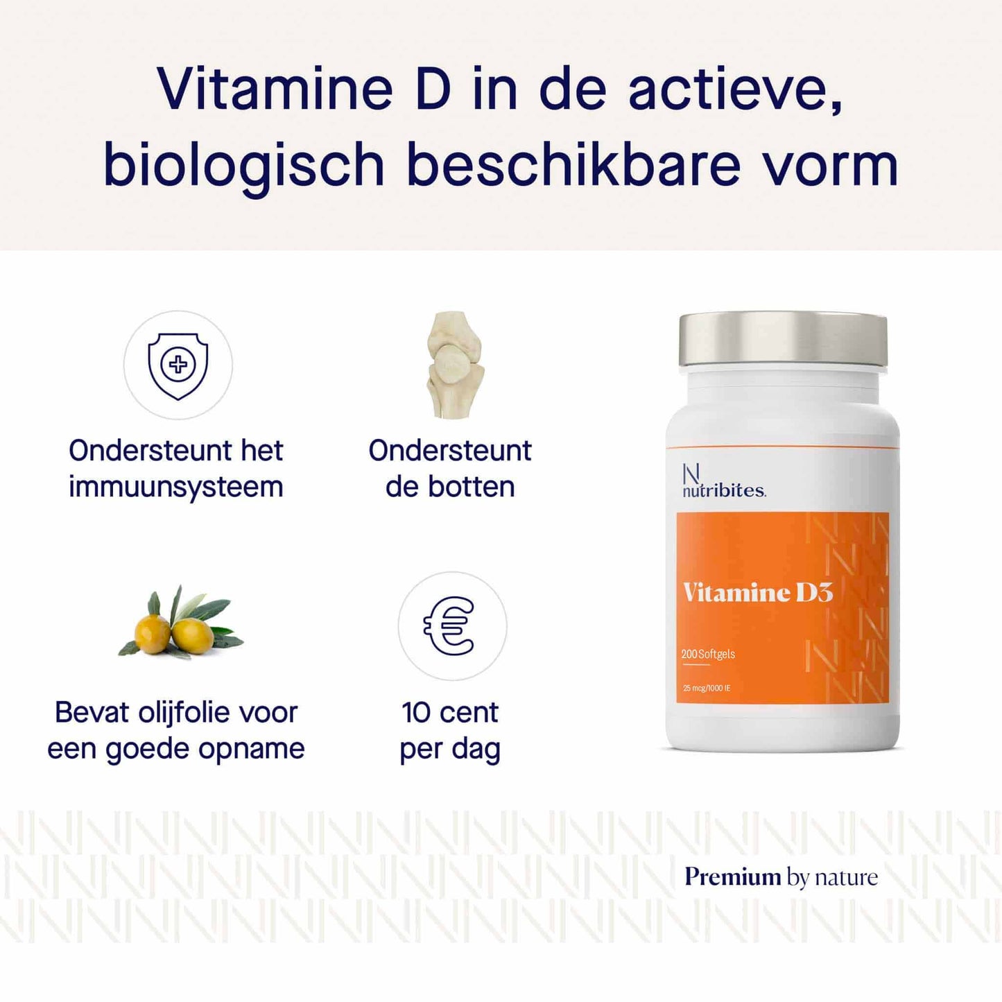 Nutribites Vitamin D3 is a potent and safely dosed vitamin D supplement that contains the natural form of vitamin D3 (cholecalciferol)—the form your body produces and therefore optimally absorbs. Vitamin D supports calcium absorption, contributes to strong bones and teeth , and plays a key role in the immune system and muscle function .
