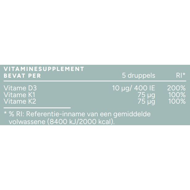 Vegan Vitamin D3/K Baby is a nutritional supplement that can contribute to the normal development and support of young children. This vegan supplement contains concentrated vitamin D3 and vitamin K and is specially formulated for use in babies and young children. A nutritional supplement is not a substitute for a varied diet.