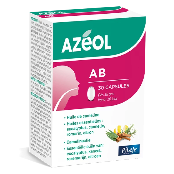 Azéol AB is een voedingssupplement met camelina-olie en etherische oliën van eucalyptus, kaneel, rozemarijn en citroen.