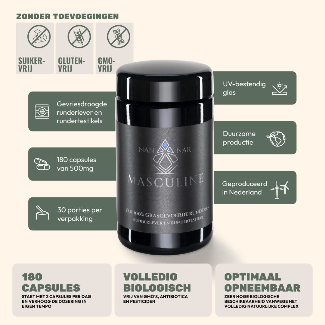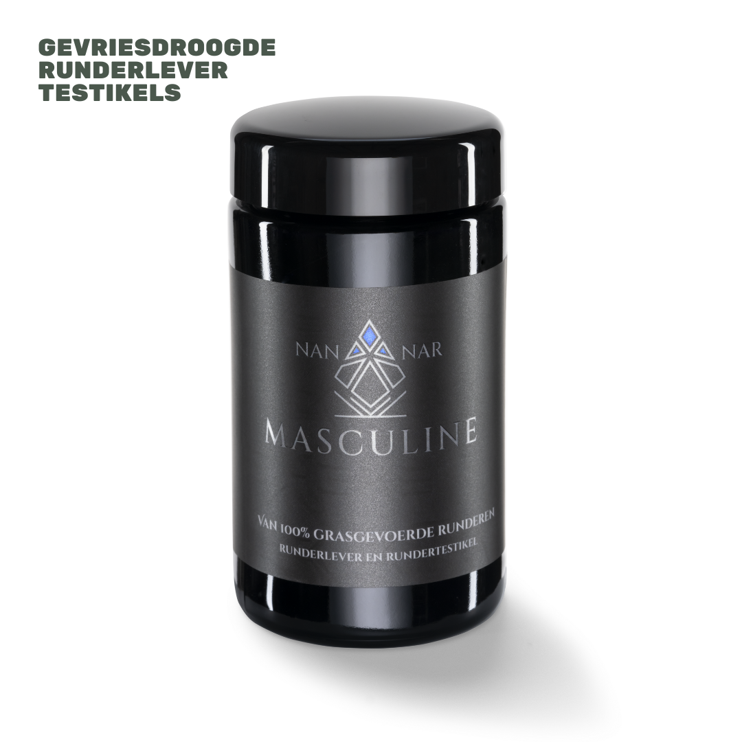 Nannar Masculine is een puur supplement voor mannen die hun energie, libido en kracht op natuurlijke wijze willen ondersteunen. De formule bestaat uitsluitend uit gevriesdroogde rundertestikel en runderlever (beide 50%), afkomstig van grasgevoerde, antibioticavrije runderen uit Nederland, zonder enige toevoegingen of vulstoffen. Vriesdrogen behoudt tot wel 99% van de voedingsstoffen, voor maximale biologische beschikbaarheid.